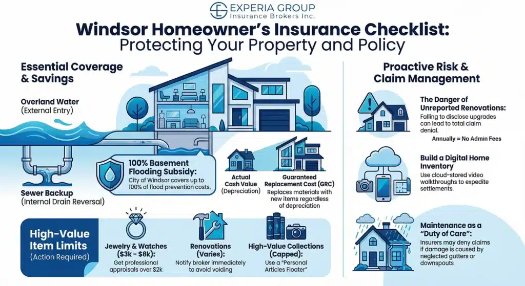 Is your Windsor home properly protected? Review this 7-point insurance checklist covering basement flooding subsidies, overland water coverage, and replacement costs.