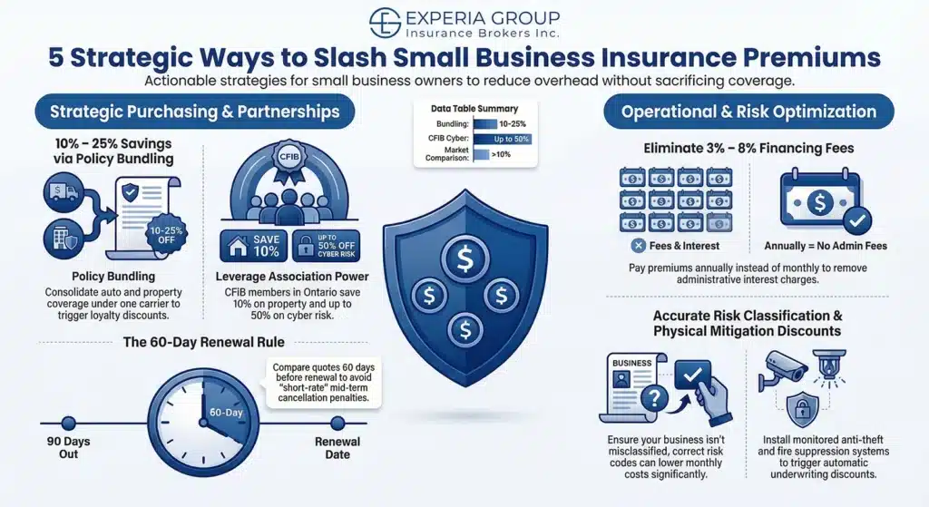 Reduce Windsor business insurance costs by up to 50%. Discover verified strategies: policy bundling, CFIB discounts, risk recategorization, and annual payment savings.